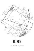 Zwart-witte landkaart, stratenplan of plattegrond van Hijken. Hijken is gelegen in de gemeente Midden-Drenthe, provincie Drenthe. Op de stadskaart zijn alle openbare wegen in Hijken opgenomen. Verder is de kaart voorzien van de coördinaten van het centrum van Hijken.