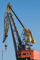 Close-up van een grote hijskraan in het havengebied van Amsterdam. Door zijn vorm krijgt de hijskraan iets sierlijks en elegants, terwijl zijn werk draait om kracht en productie geeft hij op de foto een associatie met een vogel. Een mooie tegenstelling, versterkt door de kleuren.