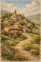Garden Path Deze prachtige illustratie toont een charmant dorpje op een heuvel, omgeven door weelderige tuinen en bloeiende wilde bloemen. Stenen huisjes met warme terracotta daken staan langs een kronkelend pad dat door een levendig landschap naar een historische kerktoren boven het dorp leidt. Hoge cipressen en glooiende heuvels…