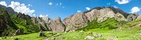 Panorama van de himalayas in China, nabij Xiahe. Prachtige bergen van verschillende foto's aan elkaar, voor een maximale kwaliteit. Sfeer van lente en zomer.
