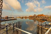 Koop de foto Hindeloopen Haven: Sluiszicht met Reflecties van Boten en Wolken van KB Design & Photography (Karen Brouwer) op canvas, aluminium dibond, (ingelijste) fotoprint, behang en ArtFrame, op maat geprint in Fine-Art kwaliteit.