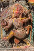 Hindoeistische sculptuur bedekt met kleurpoeder bij de Bagh Bhairab tempel in Kirtipur, Nepal