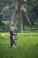 Het tempeltje, bescheiden en eenvoudig, staat symbool voor de diepe spirituele verbinding die de Balinese bevolking heeft met het land. Deze heiligdommen, verspreid over de rijstvelden, zijn plekken van gebed en offers, waar de landbouwers hun dankbaarheid tonen voor een overvloedige oogst. De combinatie van de weelderige natuur en het spirituele aspect maakt deze foto tot een uniek en inspirerend kunstwerk.