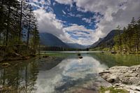 Een prachtig uitzicht op de Hintersee bij Ramsau, Berchtesgaden. De hemel en de bergen worden magisch weerspiegeld in het heldere water. Een idyllische plek om te vertoeven.