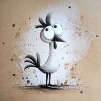 Speelse en grappige illustratie van een kip in zwart wit en beige.
