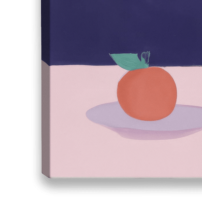 Hippe illustratie in warme kleuren. Stilleven van een witte vaas (kan) met daarin gele bloesem en daarnaast een oranje vrucht en een rood kopje op een roze tafel tegen een paarse achtergrond.