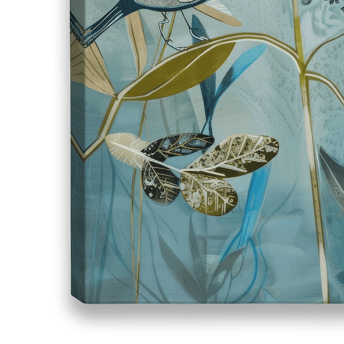 Hippe illustratie, landschap met botanische elementen en vogels. In verschillende groen en blauwtinten. Kies zelf het formaat en materiaal bij deze blikvanger!