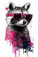 Een schattige wasbeer in een zwart-witte lijntekening draagt een opvallende roze zonnebril en straalt een nonchalante houding uit. Het grillige beeld combineert op speelse wijze natuur en mode.