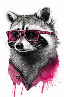 Een schattige wasbeer in een zwart-witte lijntekening draagt een opvallende roze zonnebril en straalt een nonchalante houding uit. Het grillige beeld combineert op speelse wijze natuur en mode.