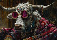 Details: koe, yak, schilderij, mode, portret, zonnebril, juwelen, roze, goud, grijs, bruin