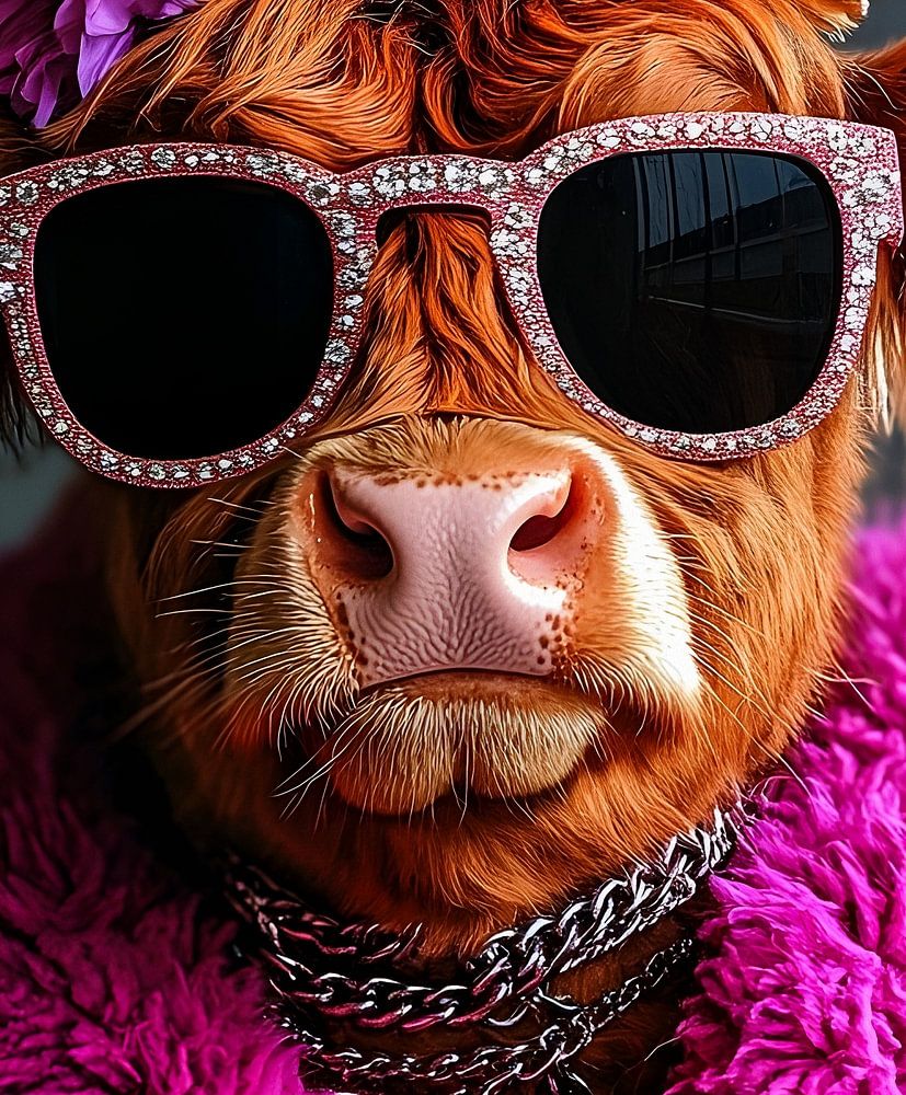 Deze stijlbewuste koe steelt de show met zijn trendy zonnebril en kleurrijke bloemen, en laat zien dat mode geen grenzen kent, zelfs niet op de boerderij!
