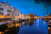 Historisch Delfshaven, Rotterdam, bij het vallen van de avond. De geel oranje verlichting van de panden en de straatlantarens kleuren mooi bij de blauwe lucht vlak na zonsondergang in de havenstad.