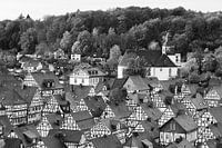 Een sfeervol zwart-wit beeld van het historische stadje Freudenberg in Duitsland, met zijn karakteristieke vakwerkhuizen die als een mozaïek tegen de heuvels liggen.