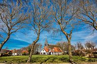 Historisch kerkje vlak buiten t dorp Makkum in Friesland, aan de rand van het IJsselmeer. De late namiddagzon verlicht ook de bomen en de witte huisjes steken fraai af in t warme licht.