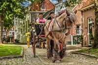 Deze foto toont een moment vol nostalgie en traditie: een sierlijke sjees, getrokken door een krachtig trekpaard, staat statig te midden van het historische Veere. In de sjees zit een paar gekleed in Zeeuwse klederdracht, hun geometrische patronen en glinsterende Zeeuwse knopen vertellen verhalen van eeuwenoude tradities. Ze nemen deel aan het ringsteken, een eeuwenoud spel waarbij behendigheid en souplesse samenkomen in een uitdagende wedstrijd.