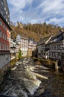 Historisch stadscentrum van Monschau in de Eifel met historische gebouwen en vakwerkhuizen langs de rivier de Rur