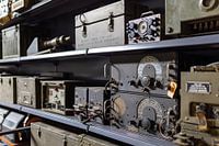 Deze fascinerende foto toont een verzameling oude radio's en communicatietoestellen uit de Tweede Wereldoorlog, zorgvuldig gerangschikt op metalen planken. De radio's, met hun gedetailleerde knoppen, wijzerplaten en bedieningspanelen, geven een authentiek beeld van de technologie die tijdens de oorlogsjaren werd gebruikt. Elke radio draagt de sporen van zijn gebruik, met lichte verwering en historische patina, wat bijdraagt aan het gevoel van nostalgie en authenticiteit.