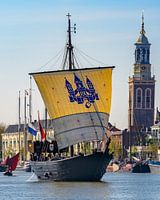 Historische replica zeilboot Kamper Kogge verlaat de Hanzestad Kampen op de rivier de IJssel tijdens een mooie lentemorgen.