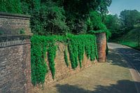 Wat deze historische scène extra bijzonder maakt, is de weelderige klimop die zich over de muur slingert. De dichte, diepgroene bladeren van de klimop bedekken grote delen van de muur en voegen een element van natuurlijke schoonheid toe aan de harde, stenen structuur. De bladeren zijn glanzend en gezond, wat duidt op een goed onderhouden omgeving en een ideale groeiplaats. Ze creëren een prachtig visueel contrast tussen het groene, levendige blad en de aardse kleuren van de verweerde stenen.