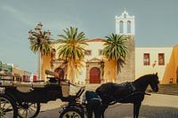 Deze foto toont een sfeervol tafereel uit Garachico op Tenerife, Canarische Eilanden. Een indrukwekkende paardenkoets staat voor de opvallende Iglesia de San Marcos, waarvan de gele gevel en de stenen kerktoren worden geflankeerd door elegante palmbomen. De culturele rijkdom van het eiland, de combinatie van traditie en koloniale architectuur worden hier perfect benadrukt. De compositie weerspiegelt het oorspronkelijke Canarische dorpsleven en maakt indruk met details zoals historische lantaarns en het rustieke ontwerp van het kerkplein. Voor liefhebbers van reizen, architectuur en mediterrane cultuur is dit motief een uitnodiging om te genieten van de geschiedenis en warmte van Tenerife. Ideaal als decoratie voor de woonkamer, het café of kantoor - deze foto creëert een gevoel van vertraging en neemt de kijker direct mee naar de zonnige steegjes van de Canarische Eilanden.