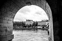 Prachtige historische gebouwen in contrastrijk zwart wit gezien dor een doorkijkje langs de Seine in Parijs. De typerende Franse torengevel hebben mooie hoge ramen en de kenmerkende dakvormen van Parijs. Voor de kade stroom de Seine.