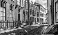 Deze zwart-witfoto vangt de tijdloze charme van de Koepoortstraat in Middelburg, met statige monumentale panden. De strakke lijnen van de gevels, de symmetrie van ramen en deuren, en het fraai smeedijzeren hekwerk voor de huizen creëren een gevoel van rust en elegantie.