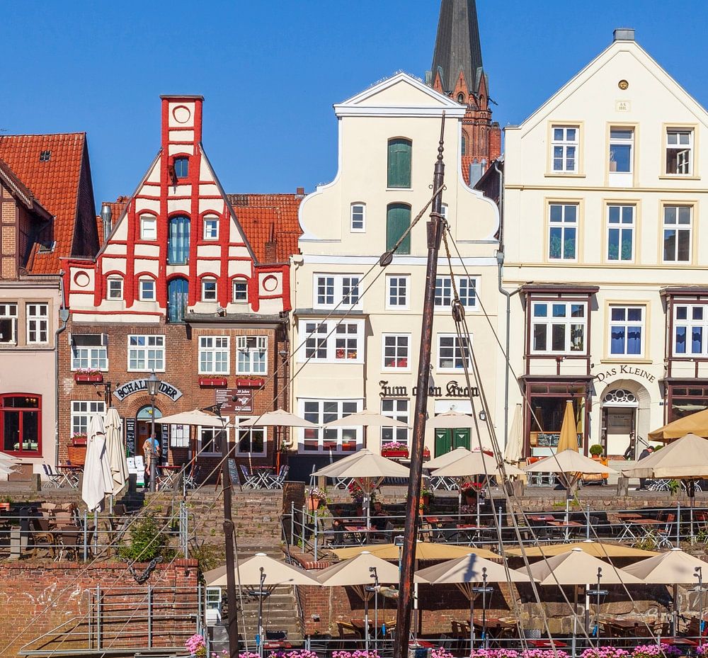 Historische huisgevels Am Stintmarkt, rivier Ilmenau