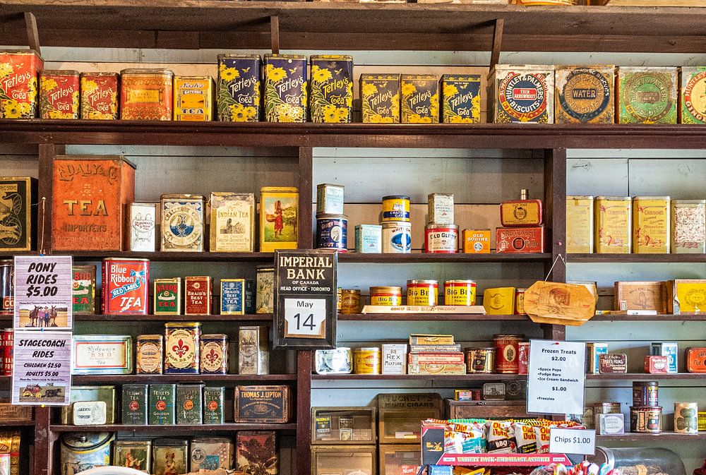 Historische kruidenierswinkel op de O'Keefe Ranch, Canada.