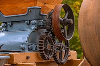 Historische tandwielen en een roestig vliegwiel vormen het middelpunt van deze close-up van een oude landbouwmachine. Dit mechanische erfgoed is een karakteristiek element van de technische tentoonstellingen op de Kaltblutmarkt in Laupheim.