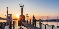 Historische veerboot Konstanz en de Imperia, een standbeeld van Peter Lenk, in de haven van Konstanz bij zonsopgang, Bodenmeer, Baden-Württemberg, Duitsland. De Imperia is het nieuwe herkenningspunt van Konstanz.