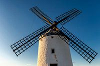 Oude windmolen op de historische route van de Cervantes-molens (Don Quichot), in La Mancha (Spanje), in een landschap bij zonsondergang.