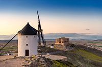 Oude windmolens op de historische route van de Cervantes-molens (Don Quichot), in La Mancha (Spanje), in een landschap bij zonsondergang, met een middeleeuws kasteel op de achtergrond.