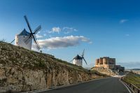 Oude windmolens op de historische route van de Cervantes-molens (Don Quichot), in La Mancha (Spanje), in een landschap bij zonsondergang, met een middeleeuws kasteel op de achtergrond.
