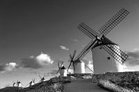 Oude windmolens op de historische route van de molens van Cervantes (Don Quichot), in La Mancha (Spanje), in een landschap bij zonsondergang