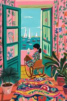 De scène wordt gezien vanuit een bruisende, kleurrijke kamer. Roze gordijnen, bedrukt met bloem- en bladmotieven in blauw, oranje en groen, omlijsten het balkon als een vrolijke theateropening. De oranje tegelvloer binnen wordt verzacht door een bontgekleurd kleed vol geometrische patronen in geel, rood, roze, blauw, groen en wit — een visueel feest van warmte en speelsheid.