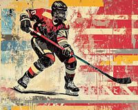 Hockey Speler - Dit is een schilderij van een hockeyspeler in actie, met krachtige kleuren zoals rood en geel, en een stijl die doet denken aan pop-art en abstracte kunst.