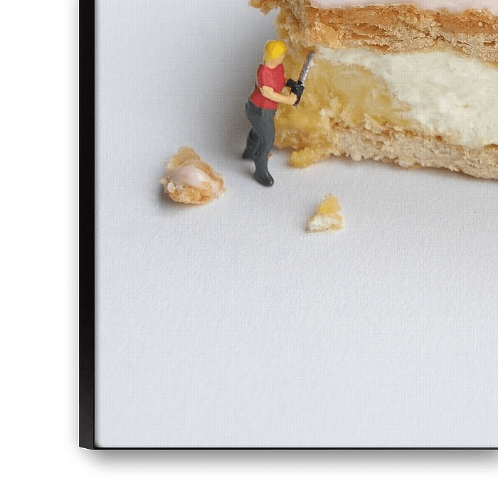 Een combinatie van miniatuur modellen en dagelijkse voorwerpen, die samen voor een humoristische situatie zorgen. Hierbij start ik met eerst goed te kijken naar de figuurtjes en wat ze aan het doen zijn. Deze handeling pas ik vervolgens toe op een item die hier normaal gesproken niet bij hoort. Dus in plaats van in de tuin te werken, werken deze mensen een stuk banket weg. De bedoeling van de foto is een lach op het gezicht van de toeschouwer te toveren.