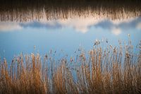 De foto is vanaf de dijk genomen en dus kijk ik omlaag. Het riet op de voorgrond staat aan het water en de reflectie boven in de foto is van het riet aan de overkant. Maar met een beetje fantasie lijkt het ook net alsof ik recht voor het riet sta aan de onderkant en daarachter de 'echte' lucht zie. Dan past de bovenkant niet meer en dat maakt het geheel uitdagend. Maar goed misschien ben ik de enige en ziet U gewoon warm riet en een weerspiegeling ;).