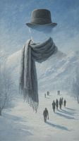 Hoed en Sjaal Parade - Het eerste dat je voelt bij dit schilderij is de grap die het speelt met aanwezigheid en afwezigheid: een losse, grote sjaal en een nette hoed zweven in een ijle, winterse lucht en suggereren een persoon die er niet echt is. Het beeld is direct en toch mysterieus — een surrealistisch kersttafereel waarin de sjaal…