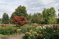 Bright autumn colours in the dahlia gardens with an acer tree showing its russet leaves. gardens, garten, city, hohenpark, hoehenpark, park, Dahlien-Show, japanese maple,