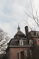 Deze foto vangt het verlaten mansion in de winter, gezien vanuit een hoekige positie achter dichtbegroeide struiken. Het mansion zelf is omhuld door een deken van sneeuw, maar wat deze opname bijzonder maakt, is de manier waarop het dak zich boven de verweerde muren uitstrekt. Het scherpe punt van het dak lijkt te wijzen naar de grijze lucht, terwijl de sneeuw zich als een dunne laag over het gebouw verspreidt. De struiken aan de voorgrond creëren een gevoel van verborgenheid, alsof het mansion zijn geheimen zorgvuldig voor de buitenwereld verbergt. De koude, winterse sfeer wordt versterkt door de ijzige stilte die het verval van het gebouw omhult, waardoor de foto tegelijkertijd een gevoel van verlatenheid en mysterie uitstraalt.