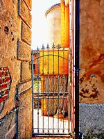 Dit fotokunstbeeld komt van een foto die ik nam na een toevallige blik aan de achterkant van een kerk in Vaiano in Umbrië, Italië. Een blik door de mooie versierde metalen poort onthulde allerlei vormen en texturen, met een rietscherm, bijgebouwen en het uitzicht op de ronde architectuur aan de achterkant van de kerk. In combinatie met de decoratieve muren die de metalen poort omzomen, en zelfs de zwarte regenpijp, vond ik dit een heel decoratief uitzicht met verschillende hoeken, vormen en kleurschakeringen.
