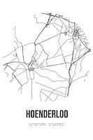 Zwart-witte landkaart, stratenplan of plattegrond van Hoenderloo. Hoenderloo is gelegen op de Veluwe, in de gemeente Apeldoorn, provincie Gelderland. Op de stadskaart zijn alle openbare wegen in Hoenderloo opgenomen. Verder is de kaart voorzien van de coördinaten van het centrum van Hoenderloo.