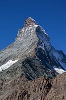 De Hoernligraat (Hörnligrat) van de Matterhorn gezien vanaf het wandelpad naar de Hoernlihut. De prachtige spitse piek steekt majestieus af tegen de hemel. De berg boven Zermatt in de zwitserse Alpen is een geliefd doel voor alpinisten en bergbeklimmers.