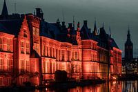 Parlementsgebouwen aan de Hofvijver in Den Haag. Lichtevenement vanwege Feest aan Zee; 200 jaar badplaats Scheveningen. De gebouwen worden in de avond uitgelicht met roodkleurige lampen. The Hague Highlights.