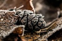 Prachtige dennenappel in het bos van de Hoge Veluwe. Een klein beetje vorst maakt het landschap alleen maar mooier en unieker.