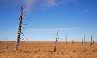 Hoge Venen, Belgie, panoramafoto met oude, verbrande bomen in rustige kleuren
