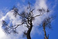 Bomen met bijzondere vormen in de Hoge Venen, Belgie. Opkijkend naar de blauwe lucht met witte wolken.