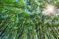 Prachtige kleurrijke groothoek opname van hoge bomen in het bos met zonlicht wat door de takken schijnt in de zomer