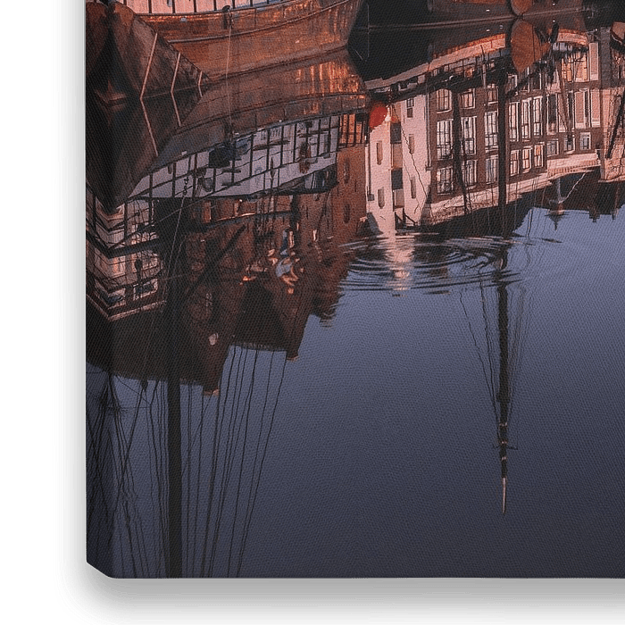 Prachtige reflecties in het kanaal aan de Hoge der A met woonboten, pakhuizen en grachtenpanden. Dit is het mooiste gebied in de historische binnenstad van Groningen.